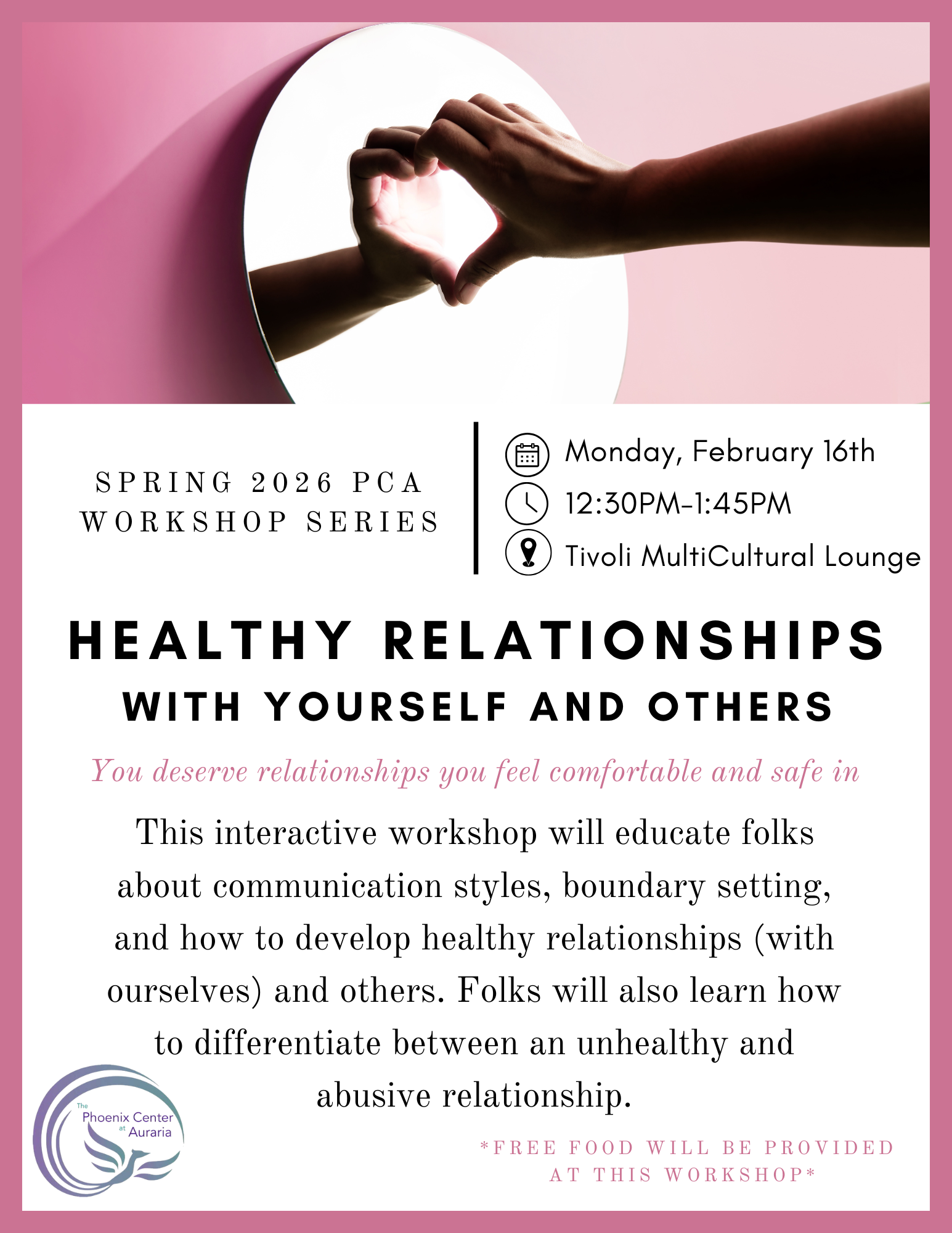 This interactive workshop will educate folks about communication styles, boundary setting, and how to develop healthy relationships (with ourselves) and others. Folks will also learn how to differentiate between an unhealthy and abusive relationship.