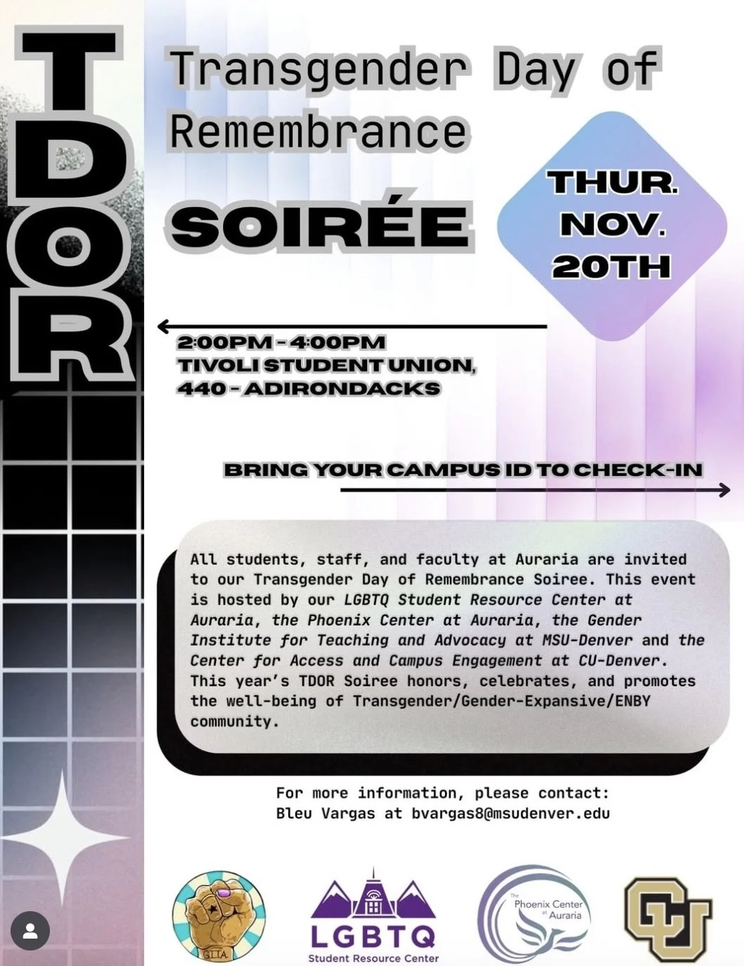 This year’s TDOR Soiree is hosted by our LGBTQ Student Resource Center at Auraria, the Phoenix Center at Auraria, the Gender Institute for Teaching and Advocacy at MSU-Denver and the Center for Access and Campus Engagement at CU-Denver.