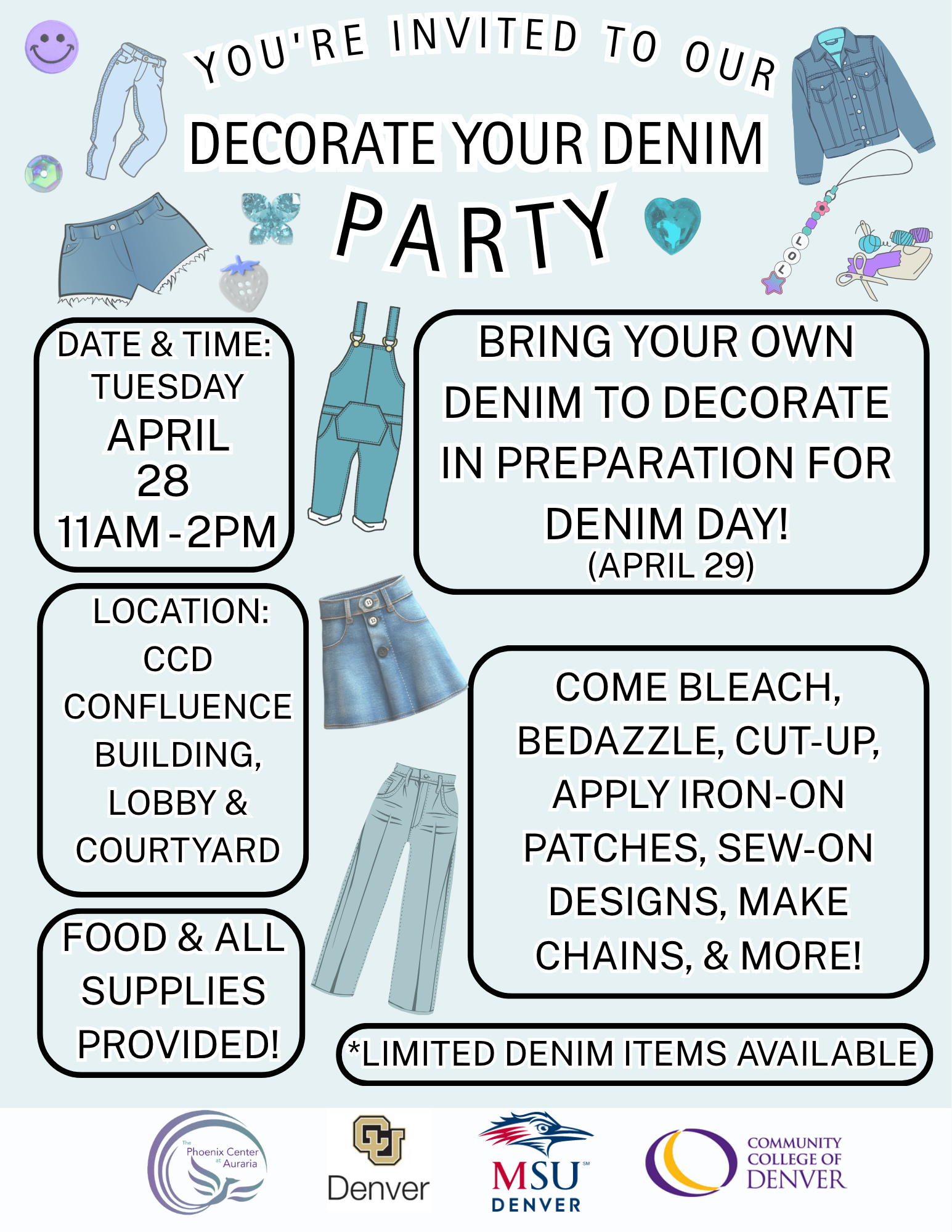 Get your denim ready for Denim Day on April 29th at our Decorate Your Denim! Party!