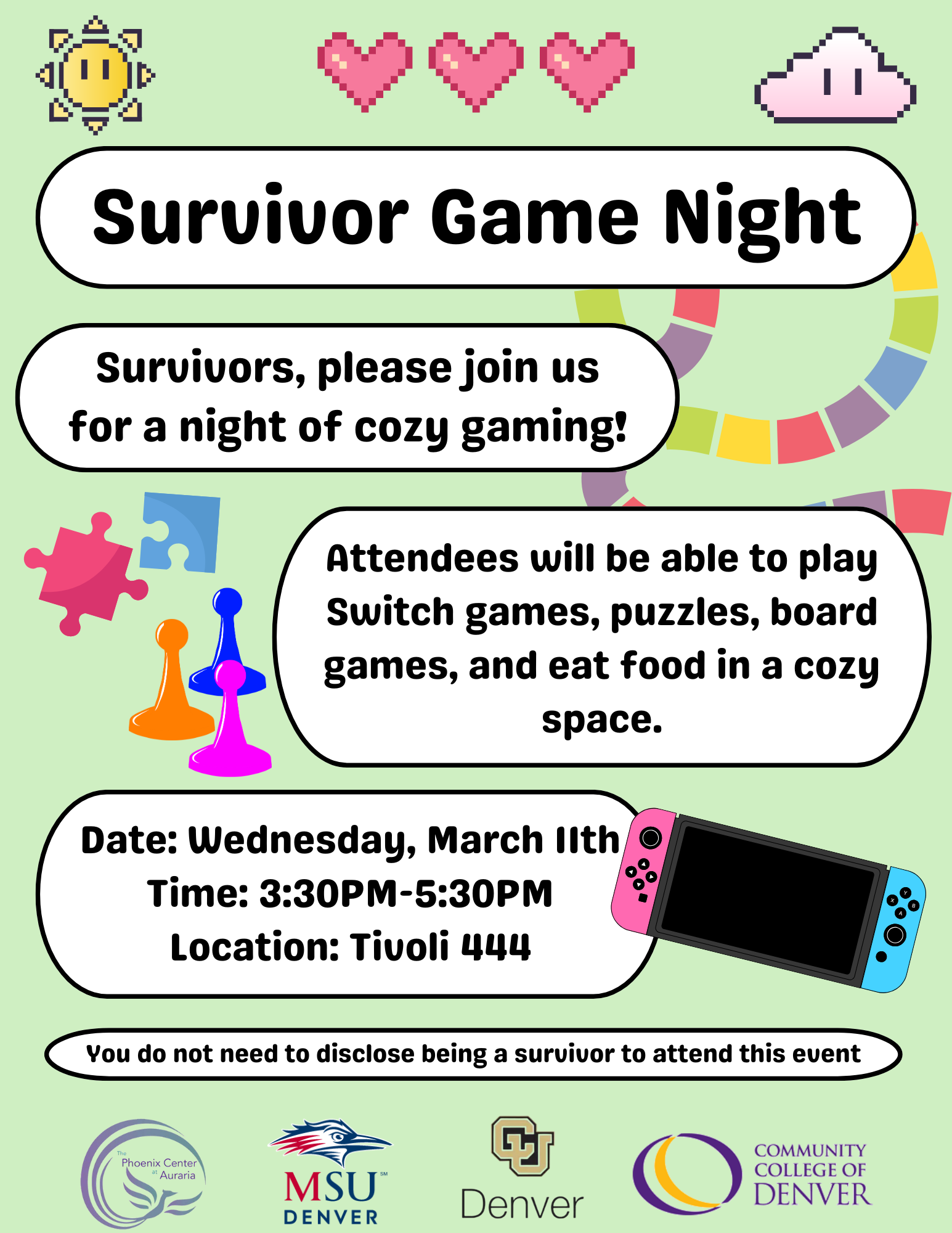 We will be playing Nintendo Switch games, board games, and eating food. Feel free to bring your own switch or board games to play!
